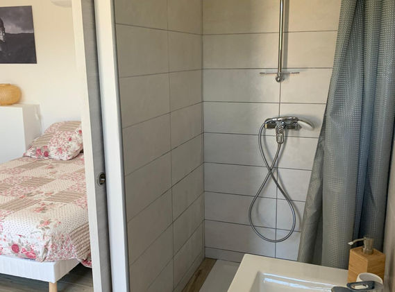 Charmante chambre très calme, climatisée avec salle d'eau, orientée Nord-Est vue jardin et échappée mer. Terrasse privative. Décoration raffinée. Literie haut de gamme en 140cm.